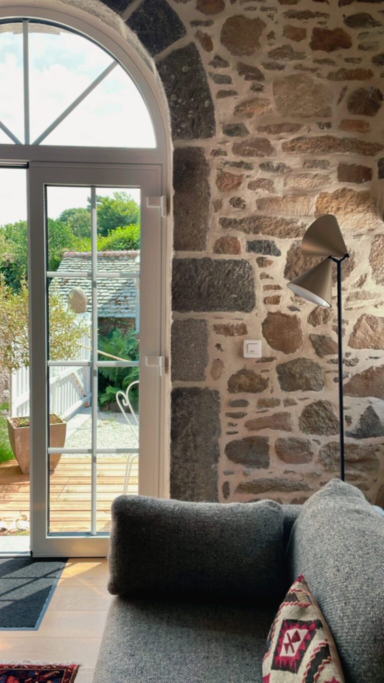 Nous vous ouvrons les portes de la Charretterie, fraîchement rénovée en 2025. Derrière son arche sculptée sur place, cette petite maison dévoile de beaux volumes, avec notamment un plafond cathédrale qui lui donne une vraie sensation d’espace. Chaleureuse et confortable, elle conjugue parquet en chêne, pierres apparentes et lumière naturelle omniprésente grâce à son exposition plein sud.